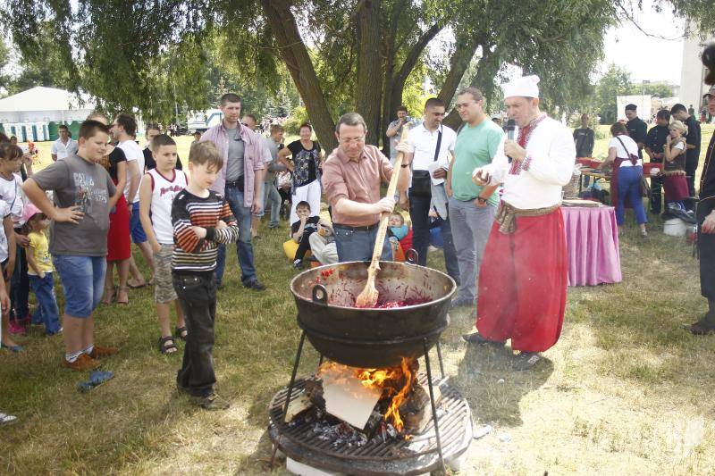 Что любопытно, готовить вкусности для горожан помогал лично Геннадий Корбан, помешивая на огне зажарку здоровенной дубовой кописткой – лопатой.