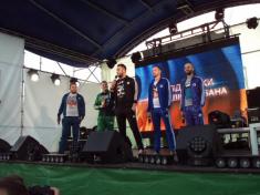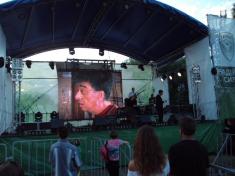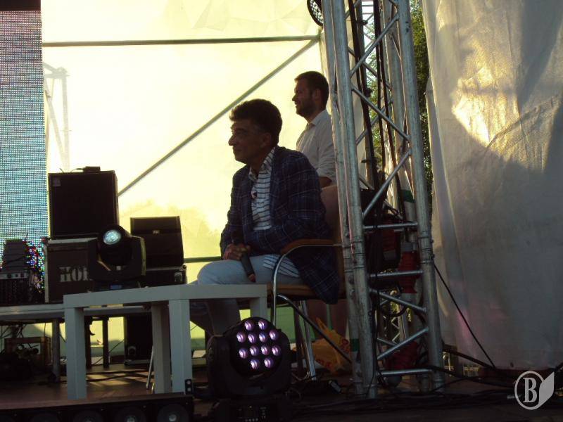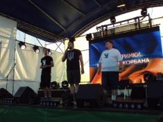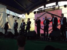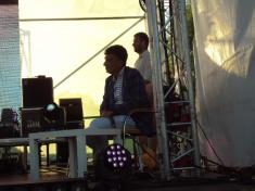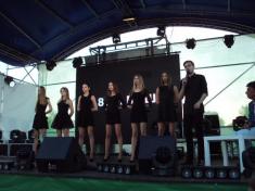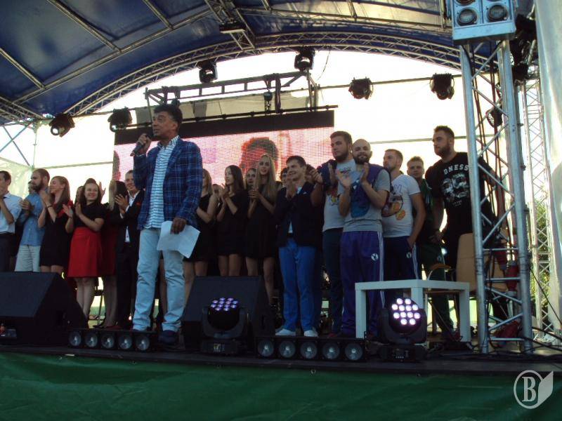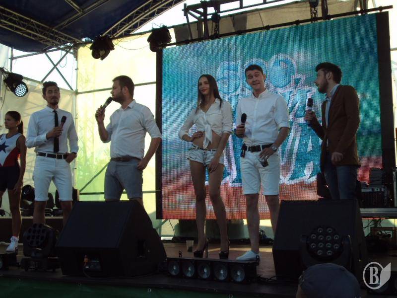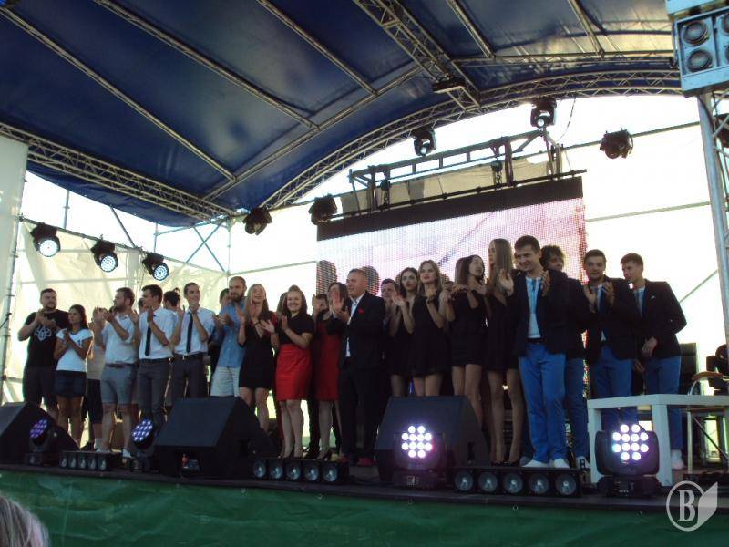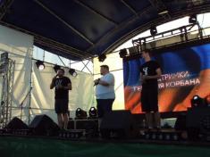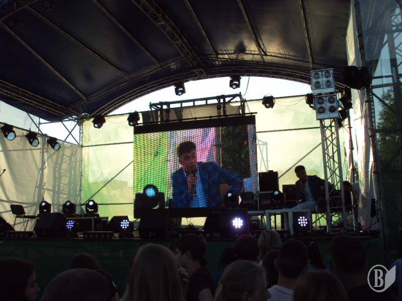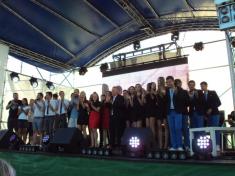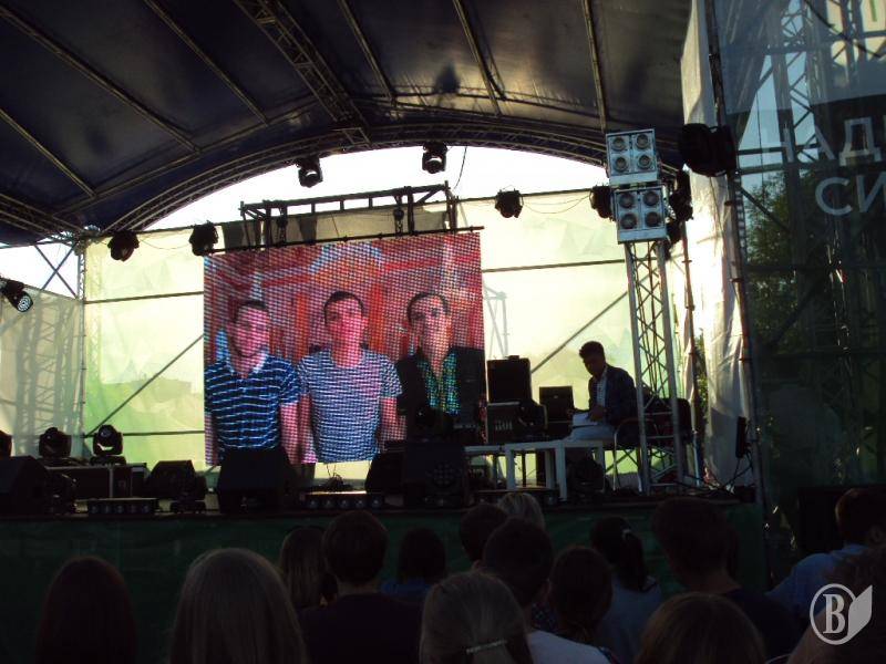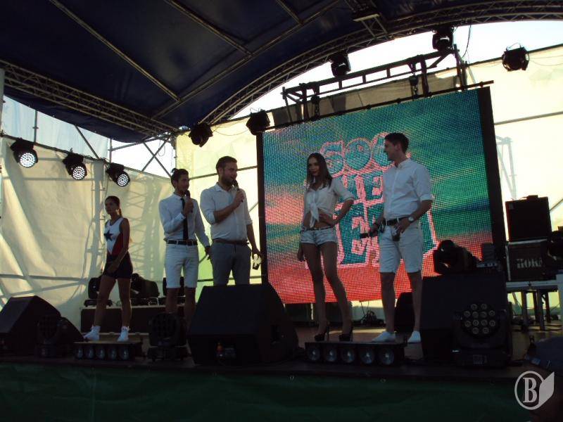 В 19:00 под музыку известной всем песни "Про зайцев", которую многие знают по монументальному фильму "Бриллиантовая рука", на сцену вышел фронтмен Театра КВН ДГУ, известный и титулованный актер и КВНщик - Евгений Чепурняк. А вслед за ним на сцене появился весь состав театра КВН, который во главе со своим лидером исполнил дебютную музыкальную композицию, приветствующую всех зрителей, собравшихся возле сцены.