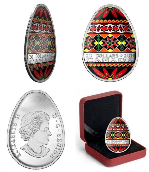 Уперше за свою історію Королівський канадський монетний двір випустить монету у формі яйця — «Традиційну українську писанку». Це буде кольорова монета з чистого срібла вагою в одну унцію з обмеженим тиражем у 4 тисячі екземплярів.