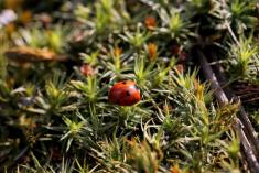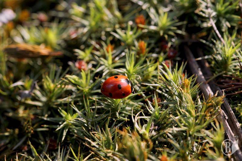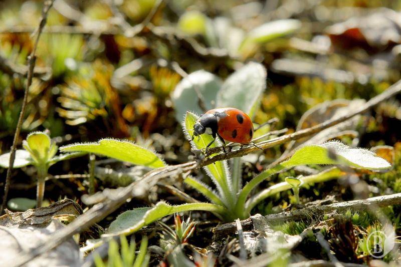 Иду на опушку и вижу под кустами уже какие-то грибки вылезли. Ставлю макрообъектив и начинаю колдовать. Когда поприсмотрелся, то увидел божью коровку, кстати их очень много уже повылезало греться на весеннем солнышке.