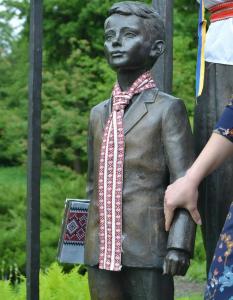 Скульптура вчительки одягнула вінок і вишиванку, хлопчику студенти заманіжили груди та книгу. Одягання розпочалося зранку. Ним займалися студрада університету соціально-гуманітарного відділу.