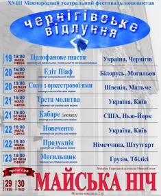 З 19 по 23 червня в рамках XVІІІ Міжнародного театрального фестивалю моновистав «Відлуння» на сцені Чернігівського обласного академічного українського музично-драматичного театру імені Т.Г.Шевченка буде представлено 8 сценічних робіт талановитих акторів з різних театрів і різних країн. До участі у фестивалі запрошені кращі виконавці з Білорусі, Грузії, Німеччини, США, України, Швеції. У цьогорічній фестивальній програмі окрім державних театрів можна побачити авторські проекти та вистави недержавних закладів.