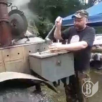 Разливает черниговцам уху... кто бы вы думали? Вадим Антошин, в настоящее время - голова общественного совета при ОГА. Как говорит, «от души». Говорил также, что «организовал» рыбаков, которые привезли из Днепра 20 кг леща.