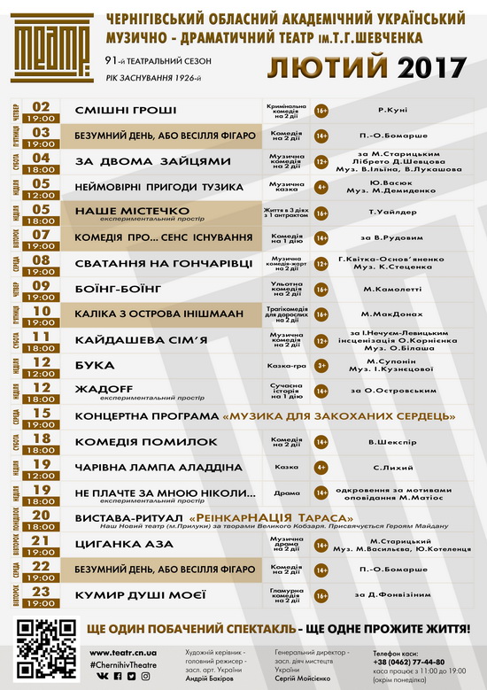 Репертуар Чернігівського облмуздрамтеатру ім. Шевченка на лютий