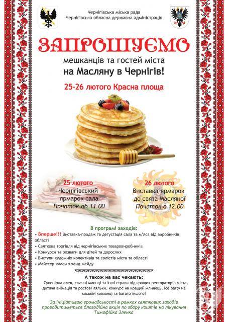 На гостей свята чекають: тематичні конкурси та спортивно-розважальні заходи, майстер-класи з хенд-мейду, дитяча анімація, конкурс на кращий малюнок млинця, виступи творчих колективів та виконавців міста, народна фольклорна програма. Увечері свято завершить яскрава шоу-програма.