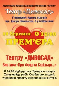 Цей колектив був створений на базі обласної благодійної організації «АРАТТА» понад 10 років тому. В його творчому доробку вистави за творами братів Грімм, Клайва Льюіса, Екзюпері, Люіса Керрола, Бродського, Шекспіра, Гоголя, Старицького. Керує театром надзвичайно енергійна та життєрадісна людина – пані Ірина Пісня. Тож запрошуємо на прем’єру в неділю, 19 березня о 15.00! Місце зустрічі – будинок культури по вул. Дмитра Самоквасова, 8 (в мікрорайоні «Шерстянка»). Родзинка заходу – ярмарок сувенірів від учасників проекту «Повноцінне життя!» (реалізується за підтримки ЄС у партнерстві з Українським незалежним центром політичних досліджень (УНЦПД) та Спілкою Робітничих Самаритян-Грузія).