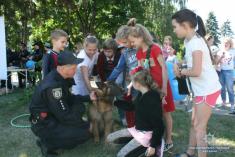 Поряд на галявині діти спостерігали за роботою поліцейської собаки Вільми та її вміннями розшукувати будь-які предмети. Батьки із задоволенням робили фото із чотирилапим помічником поліції, а малюки гладили таку величезну, але таку спокійну вівчарку.