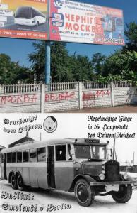 А ще – автобуси! Автобуси на Москву. Це щось на зразок того, аби під час війни СРСР та Третього Рейха трудящим СРСР вішали на вулицях біг-борди з написами «Регулярные рейсы Смоленск–Берлин», «Поездки в столицу Рейха, одобрено фюрером!», «Ознакомительно-доверительные беседы в Гестапо по прибытии»…