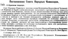 Совет Народных Комиссаров, заслушав доклад председателя Чрезвычайной комиссии по борьбе с контрреволюцией о деятельности этой комиссии, находит, что при данной ситуации обеспечение тыла путем террора является прямой необходимостью; что для усиления деятельности Всероссийской чрезвычайной комиссии и внесения в нее большей планомерности необходимо направить туда возможно большее число ответственных партийных товарищей; что необходимо обеспечить Советскую Республику от классовых врагов путем изолирования их в концентрационных лагерях; что подлежат расстрелу все лица, прикосновенные к белогвардейским организациям, заговорам и мятежам; что необходимо опубликовывать имена всех расстрелянных, а также основания применения к ним этой меры.