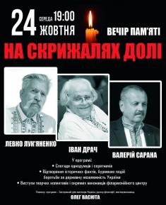 У середу, 24 жовтня, о 19 годині розпочнеться вечір пам’яті «На скрижалях долі. Левко Лук'яненко. Іван Драч. Валерій Сарана».