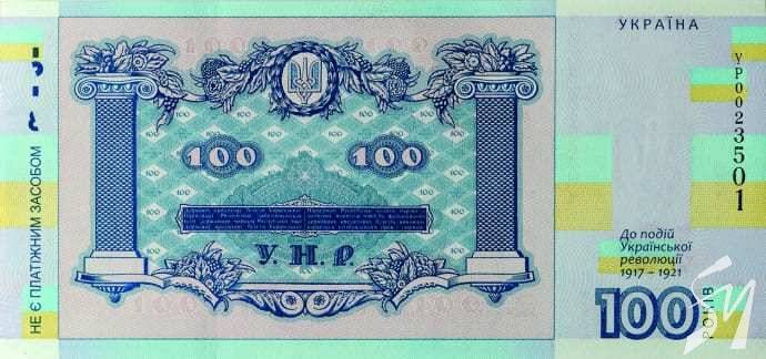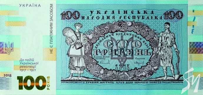 Це сувенірнв НЕплатіжна банкнота “Сто гривень”, яка відтворює дизайн української банкноти номінальною вартістю 100 гривень, введеної в обіг 17 жовтня 1918 року.