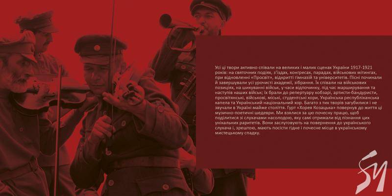 «Пісні Української Революції» – це ще один нестандартний підхід до популяризації української історії. Адже українці мають почути голоси тієї доби, щоб пізнати дух, ідеали, прагнення та перемоги Української революції 1917–1921 років. Ті люди, які боролись за свою державу тоді подібні до теперішніх воїнів, які боронять свободу і незалежність України від новітніх зазіхань давнього ворога нині», – говорить Голова Українського інституту національної пам’яті Володимир В’ятрович.