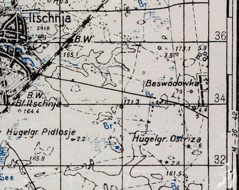На півночі було ще два кургани (північно-західні дальні візири). Між ними пролягала дорога з Ічні до Іржавця і поблизу був колодязь (позначка Br).