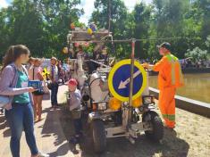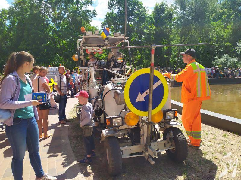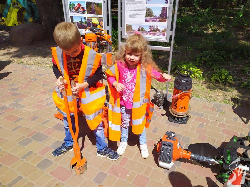 Тут були і дорожній каток, навантажувач, фреза, повітрядувка, маркувальна машина для нанесення розмітки, кущоріз, керновідбірник, курвиметр, пірометр, дорожні знаки та конуси. Дітлахи, що прийшли знайомитись з професією дорожника, були в захваті.