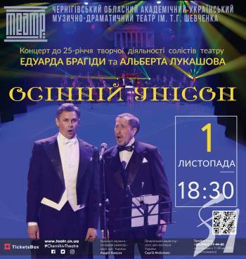 1 листопада (п’ятниця) о 18.30 запрошуємо на творчий вечір «ОСІННІЙ УНІСОН» - концертну програму до 25-річчя творчої діяльності солістів Чернігівського драмтеатру ім.Т.Шевченка Едуарда Брагіди та Альберта Лукашова.