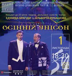 1 листопада (п’ятниця) о 18.30 запрошуємо на творчий вечір «ОСІННІЙ УНІСОН» - концертну програму до 25-річчя творчої діяльності солістів Чернігівського драмтеатру ім.Т.Шевченка Едуарда Брагіди та Альберта Лукашова.