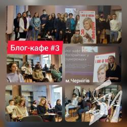 Це правозахисна програма для молодих лідерів громад, метою якої є підвищення їх активності у суспільних процесах та посилення впливу на формування сучасного медіа-простору через використання такого сучасного комунікаційного каналу як блогерство. 17 жовтня 2021 відбулося Блог-кафе №3 «Копірайтинг у соцмережах» (модератор – членкиня ГО «Чернігів європейський», кандидатка наук з державного управління, завідувачка кафедрою маркетингу, PR-технологій та логістики Анна Вербицька). Під час заходу учасники блог-кафе ознайомилися з основами копірайтингу як інструменту блогера та громадського активіста: способами передачі емоцій у тексті, анти-правилами написання тексту для блогу.
