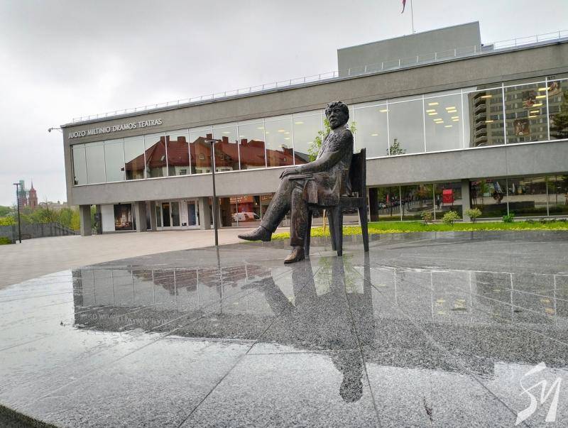 Три театри Панявежиса мене зачарували уже на підході. Це насамперед драматичний театр Юозаса Мільтініса з пам'ятником засновнику, який сидить на стільці. Уже сам пам’ятник втілює величність театрального мистецтва. Більшість вистав я переглянув саме в ньому.