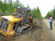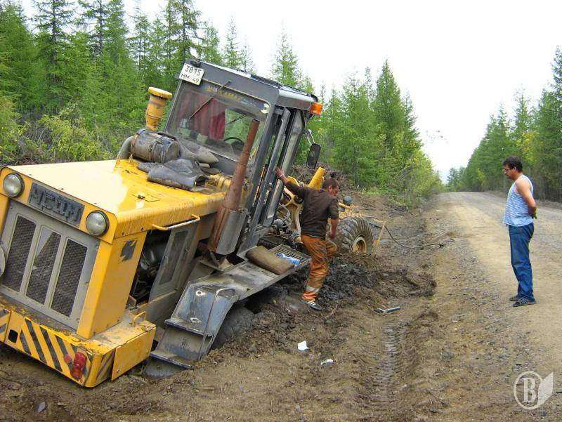 Коли влітку вічна мерзлота у верхніх шарах грунту розмерзається, утворюються „лінзи” – скупчення води під землею, про розташування яких навіть можна не здогадуватись. В таку ось „лінзу” і провалився грейдер, і тепер врятуватися з пастки він міг тільки завдяки допомозі потужного трактора чи бульдозера.
