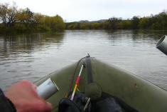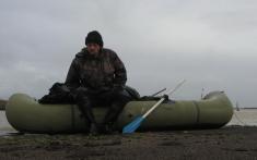 Оказалось, что Геннадий проживает на другом боку мыса, в тех домах, до которых я вчера не дошел. В 9.20 утра отчалил, вошел в устье Радуги и вскоре плыл по достаточно широкой, но чрезвычайно мелкой реке Камчатке. В этом месте она была метров в 400 в ширину, но даже на середине реки было трудно найти глубокое место. Моль и песчаные острова не давали возможности двигаться с той скоростью, с которой вчера плыл по Асхаве и Радуге. Течения на середине Камчатки, куда я сначала выгреб, почти не было. Приходилось работать веслами, которые время от времени доставали до речного дна.
