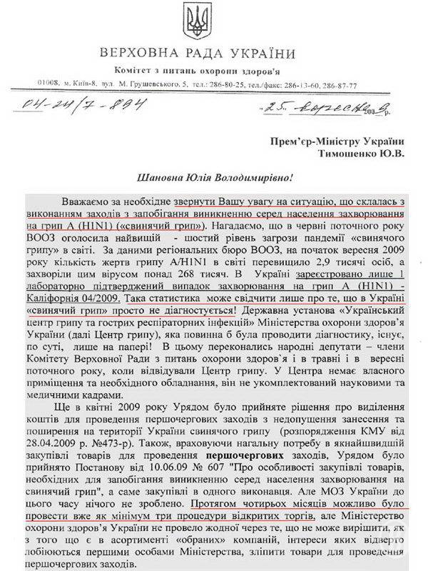 Вопрос готовности Украины справиться с эпидемией гриппа А/H1N1 был на постоянном контроле профильного Комитета Верховной Рады Украины. «Буквально месяц назад мы обратились к Премьер-министру Украины с требованием лично вникнуть в этот вопрос и принять соответствующие решения. К сожалению, многие из наших предостережений подтвердились, и на сегодня власть не готова в полной мере защитить своих граждан от этой чрезвычайной ситуации», - резюмировала депутат-регионал.