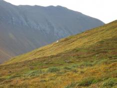 Возвращаться в „столицу” Командорских островов – село Никольское – я должен был по западному, тихоокеанскому побережью острова Беринга. Чтобы добраться до него, нужно было пересечь остров поперек по Половинной долине. Она имеет в длину приблизительно 15 километров и, если двигаться от Берингова моря, то эта долина начинается с большого болота. Чтобы обойти его, пришлось карабкаться на склоны сопок. Но и там легче идти не стало – сопки покрыты невысокими, но густыми кустами. Неизвестно, куда станет нога – то ли на кочку, то ли в яму.