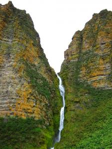 В одном месте увидел очень красивый водопад – низенький, широкий, грохочущий плотной массой ниспадающей воды. Вскоре дошел до арки Стеллера – чуда, созданного природой. Арка поражает в первую очередь своей мощностью: поперек берега стоят две массивные каменные опоры, смыкаясь сверху. Фотографировать арку Стеллера – наслаждение. Возможны разные ракурсы, но лучше всего – впритык, охватывая вдали скалистый полукруг бухты. Интересно, что сто лет тому назад арка Стеллера имела другое, оригинальное название - Штаны Тетеринова. Кем был тот Тетеринов и на самом ли деле арка так напоминала его штаны, сегодня уже неизвестно.
