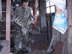 Этот домик был наименьшим из всех, которые видел на острове до этого. Его площадь составляла не больше 14 кв. метров, в ней были деревянные нары на 7 человек, 10 матрасов, почему-то подвешенных на бечевках к потолку (по-видимому, для защиты от мышей), печь, дрова, уголь, три закопченных чайника, три топора, череп оленя над дверью, большая карта Японии на стене и книга Георгия Маркового „Орлы над Хинганом”.