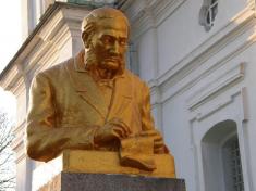 Фото "Високого Валу". Двоапам’ятники Глібову в Чернігові. Білий – перший, дореволюційний, знаходиться на території музею Михайла Коцюбинського. Другий – „золотий” радянський на території Свято-Троїцького монастиря.