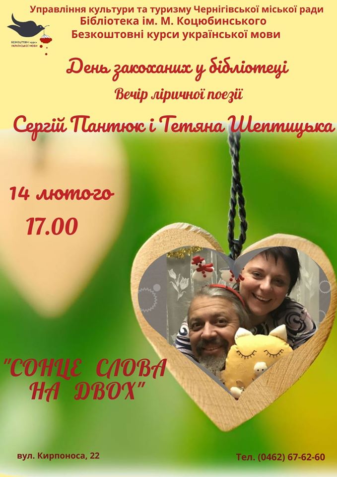 14 лютого, до дня всіх Закоханих, відбудеться вечір ліричної поезії «Сонце слова на двох» від Сергія Пантюка і Тетяни Шептицької.