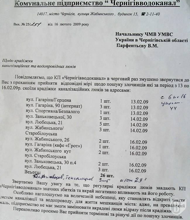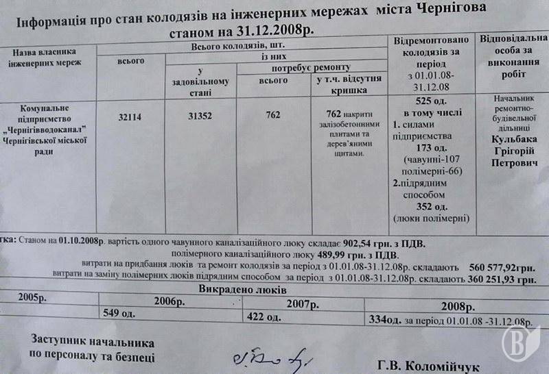 "Проблема хищения люков у нас повторяется из года в год. В прошлом году у нас своровали 324 люка. Потери составляют примерно 300 тысяч гривен." - заявил сегодня на встрече с черниговскими журналистами Григорій Коломійчук, заступник начальника КП "Чернігівводоканал".