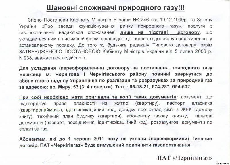 Достатньо було посадовцям ПАТ «Чернігівгазу» розповсюдити в м. Чернігові оголошення з погрозою абонентам, які до 1 червня 2011 року не уклали (переоформили) Типовий договір, затверджений постановою КМУ № 938 від 5 липня 2006 року, припинити газопостачання, як почалася справжня паніка.