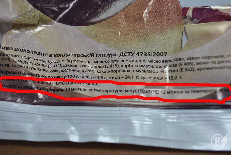 Унизу пакування зазначені строки зберігання морозива: «Строк придатності й умови зберігання: 10 місяців при температурі мінус 18 градусів і 12 місяців при температурі мінус 24».