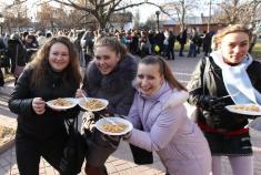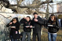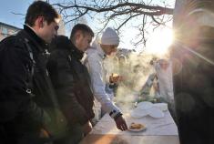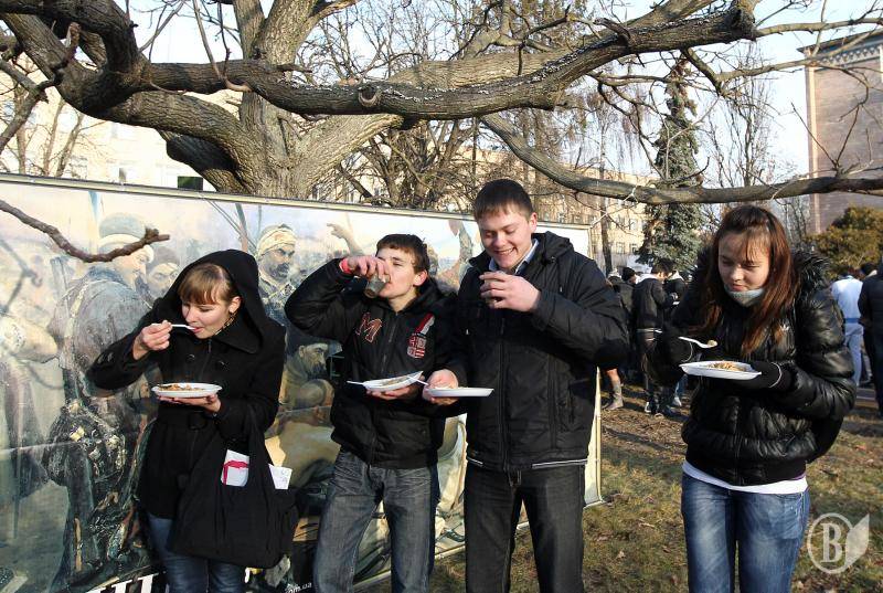 Ведучий пропонує всім активним учасникам конкурсів плавно перейти до військової кухні, де вже вправні повара пригощали зголоднілих студентів особливою стравою – пловом зі справжнісіньким м'ясом, а запивали гарячим чайком.