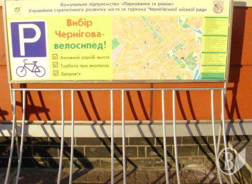 Окрім безпосередньо металевої конструкції для кріплення двоколісних, тут є ще й карта історичного центру Чернігова, де позначено визначні місця й пам’ятки обласного центру. Здалеку помітно напис «Вибір Чернігова – велосипед», під ним указано переваги цього виду транспорту: активний спосіб життя, турбота про екологію, здоров’я.