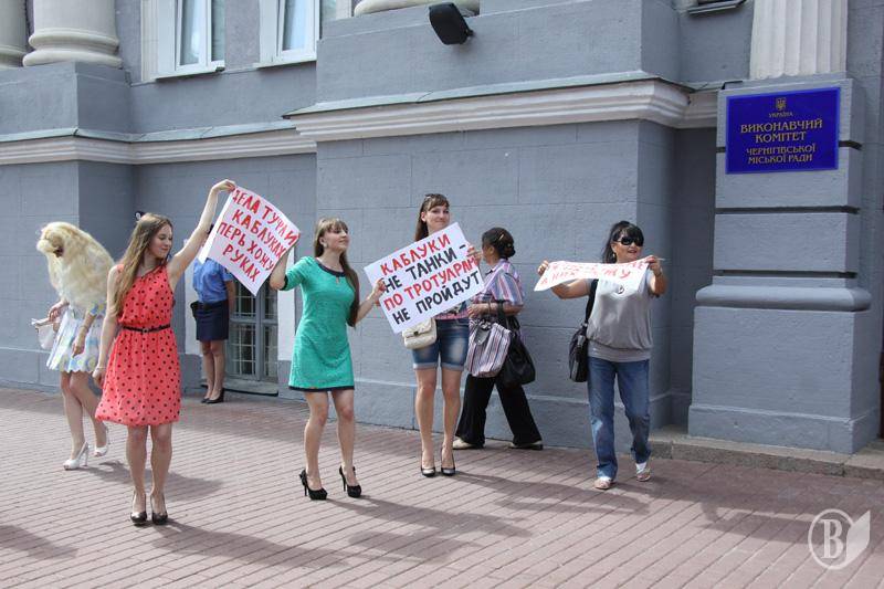 Чернігівські активістки влаштували «стометрівку» на підборах, а потім вирушили під стіни Чернігівської мерії на дефіле, щоб станцювати «бугі-вугі» у калошах.