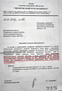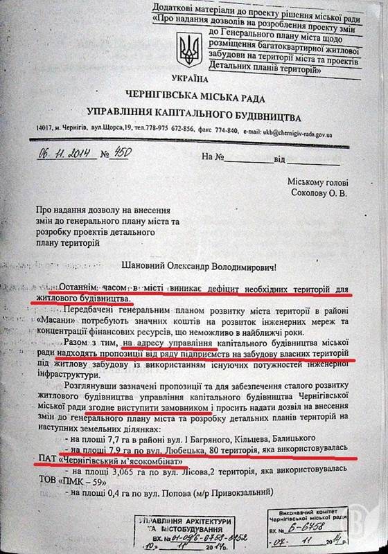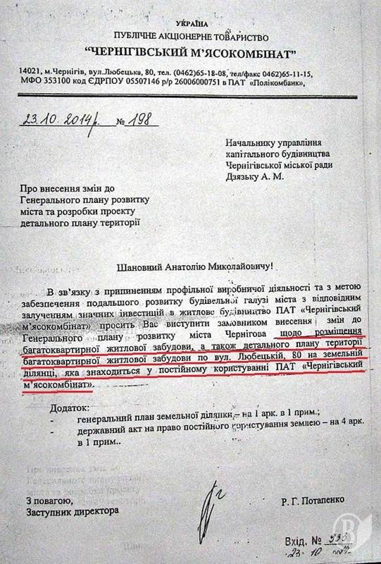 Натомість, вже починаючи із жовтня, через місяць після того, як В’ячеслав Васильченко продає контрольний пакет акцій людям Тарасовця, до управління капітального будівництва міськради надходить звернення від заступника директора Потапенка із проханням внести зміни до Геплану Чернігова та виступити замовником будівництва багатоквартирних будинків на землі, що знаходиться на території м’ясокомбінату.