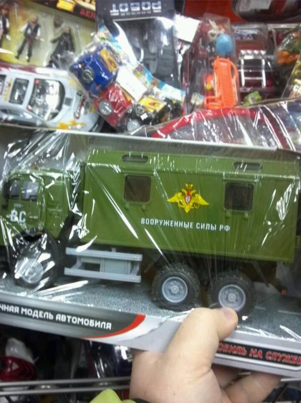 Наприклад, ось таку машинку із маркуванням «Вооруженные силы РФ» можна було побачити на прилавку з іграшками в «Седамі» за адресою Красносільсокого, 29 ще вчора.