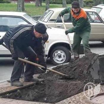 На тротуарі проспекту Миру біля чернігівського філармонійного центру тривають підготовчі роботи для посадки дерев у ті «гнізда», де й мають, за задумом, рости деревця.