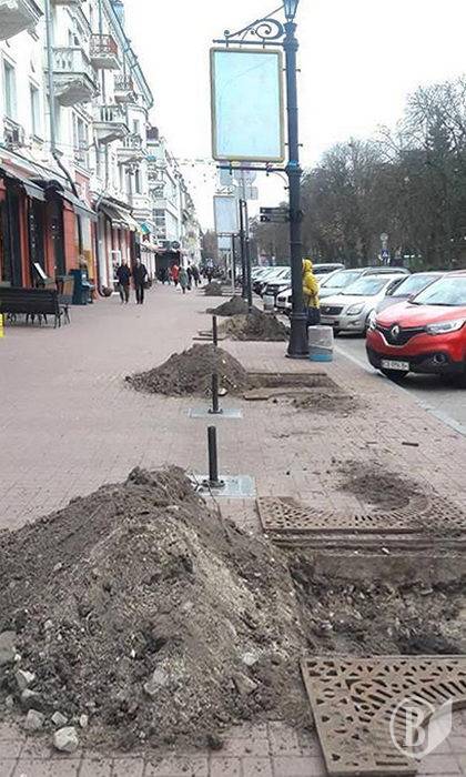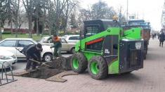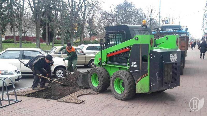 На тротуарі проспекту Миру біля чернігівського філармонійного центру тривають підготовчі роботи для посадки дерев у ті «гнізда», де й мають, за задумом, рости деревця.