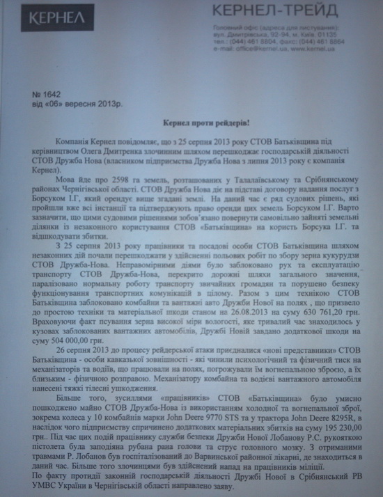 - Чому стільки днів немає розсилки прес-служби «Кернел груп» на редакційні скриньки чернігівських онлайн-медіа з офіційною реакцією на інформацію про рейдерське захоплення врожаю?