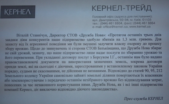 Цікавенним спектаклем для лохуватих журналістів виявилися дві «прес-конференції» адвоката-антирейдера і юриста СТОВ «Батьківщина», керівника якого «брутально затримали», а кукурудзу тимчасово «вкрали», і прес-отвєтка «агресорів» з «Кернел груп».