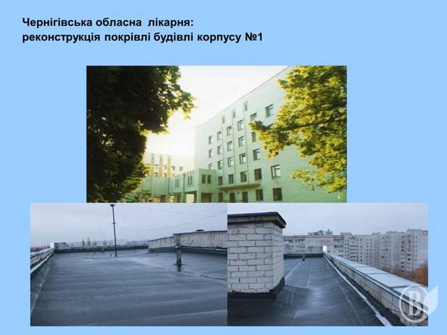 У Чернігівській обласній лікарні проведено реконструкцію покрівлі палатного корпусу № 1. На ремонт будівлі у серпні поточного року виділено 625 тисяч гривень. За рахунок цих коштів перебудовано покрівлю, замінено на металопластикові дерев’яні вікна, здійснено ремонт в палаті, де протікала стеля (будівля хірургічного корпусу лікарні введена в експлуатацію у 1966 році). Крім того, виділено 4,4 мільйона гривень із державного фонду регіонального розвитку та майже 500 тисяч гривень з обласного бюджету на реконструкцію торакального відділення, що буде введено в експлуатацію у 2016 році.