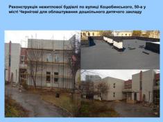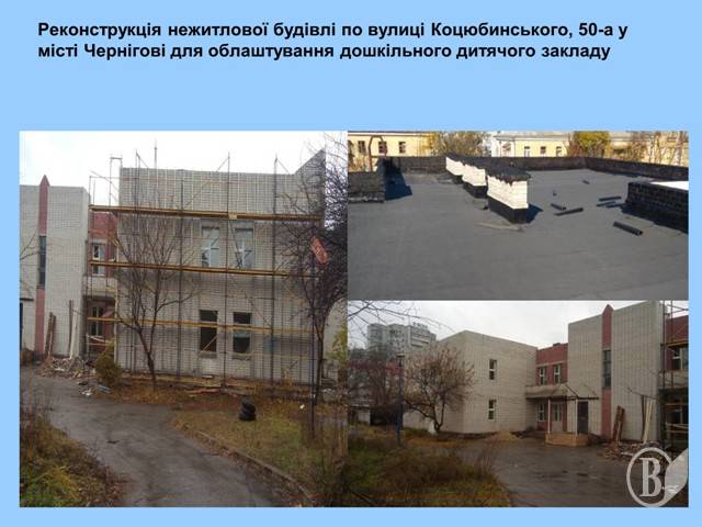 Триває перебудова нежитлової будівлі по вулиці Коцюбинського, 50-а у Чернігові на дитячий садочок. Загальна кошторисна вартість проекту в цінах поточного року – 13,7 мільйона гривень. З державного фонду регіонального розвитку виділено на це 8 мільйонів гривень, з місцевого бюджету — 5,2 мільйона.