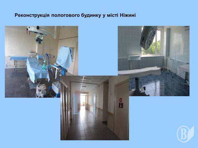 Відремонтовано приміщення Варвинської центральної районної лікарні. У Бахмацькій районній лікарні проведено реконструкцію терапевтичного відділення під поліклінічне. У Ніжині здійснено реконструкцію пологового будинку, що дасть змогу крім жительок цього міста (це 42 тисячі жінок), обслуговувати ще й жінок з п’яти прилеглих районів: Ніжинського, Ічнянського, Носівського, Борзнянського та Бахмацького.