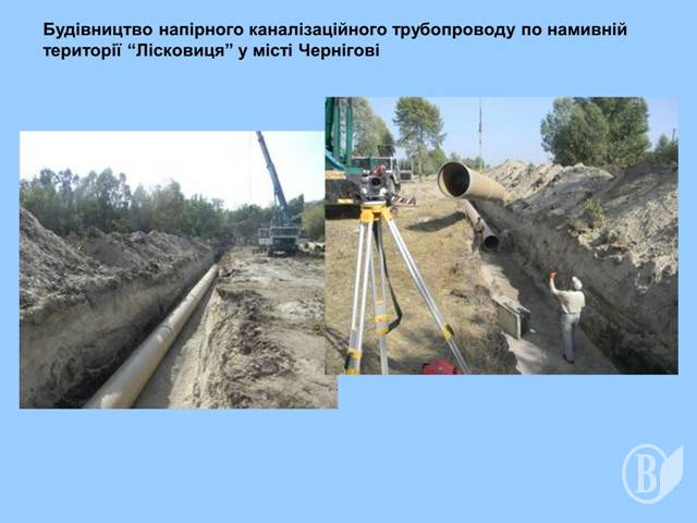 Йшлося на прес-конференції і про побудову та реконструкцію об’єктів житлово-комунального господарства. Зокрема, про будівництво у Чернігові майже двох кілометрів напірного каналізаційного трубопроводу, по якому стоки надходитимуть на очисні споруди. Пропускна спроможність трубопроводу дозволить виключити з експлуатації існуючі аварійні ділянки і здійснити перекачку всіх стоків по трубопроводу, що будується. Загальна кошторисна вартість робіт складає 22,9 мільйона гривень. Станом на сьогодні побудовано 885 метрів напірного трубопроводу, загальна вартість робіт склала 8,7 мільйона гривень.