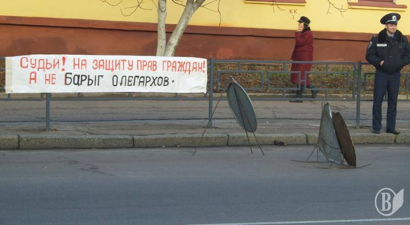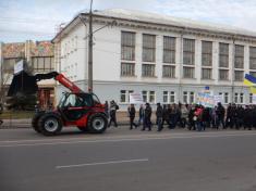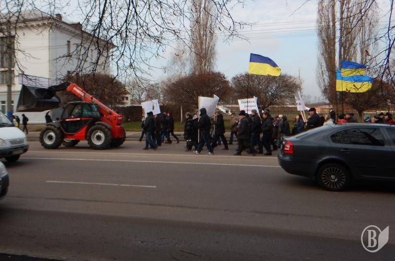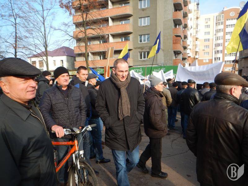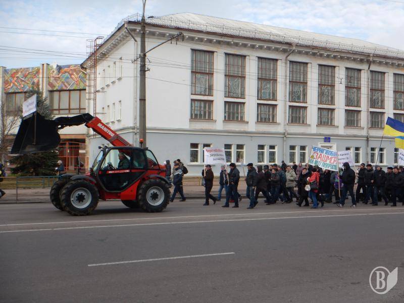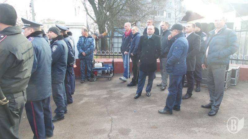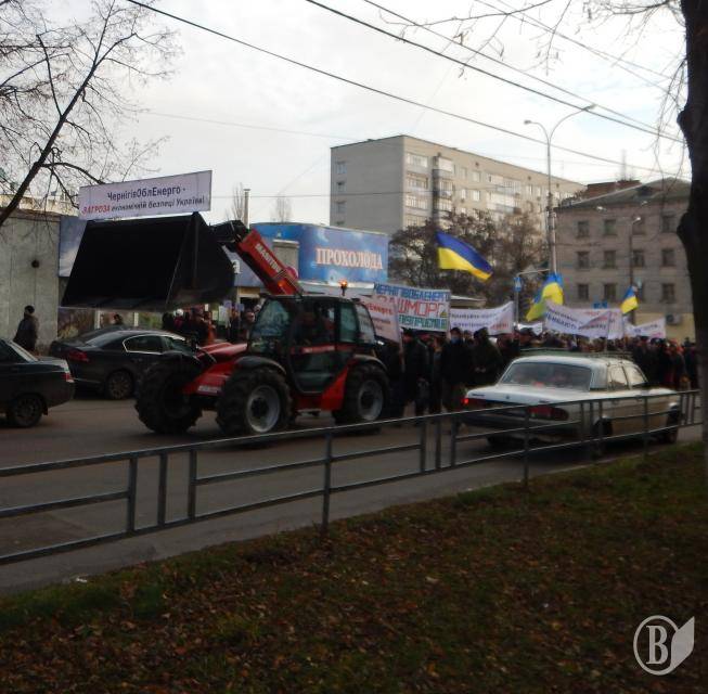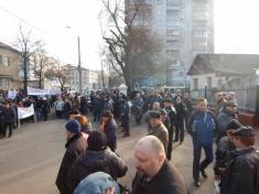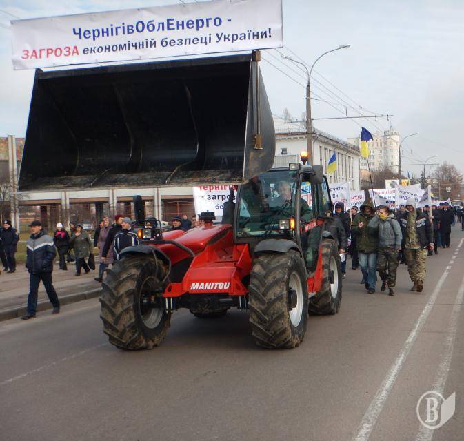 Потом протестующие выстроились в колонну - в целом около 600 человек – и прошли по проспекту Победы к помещению компании «Черниговоблэнерго». Там выстроился заслон из двух радов милиции, за которым на возвышении, как на трибуне стояло руководство компании. Председателя правления Ткача охранял чуть ли не наибольший в Чернигове охранник.