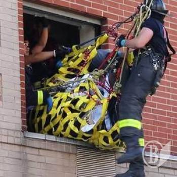 Тож пенсіонерку, яка вже рік не виходила із дому, довелося транспортувати за допомогою підйомного крану і спеціальної сітки.