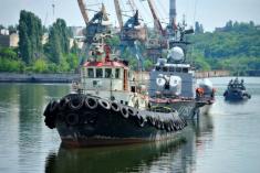 Катер сделал выход из Николаевского судостроительного завода, где его ремонтируют, с помощью буксира “Зюйд”.