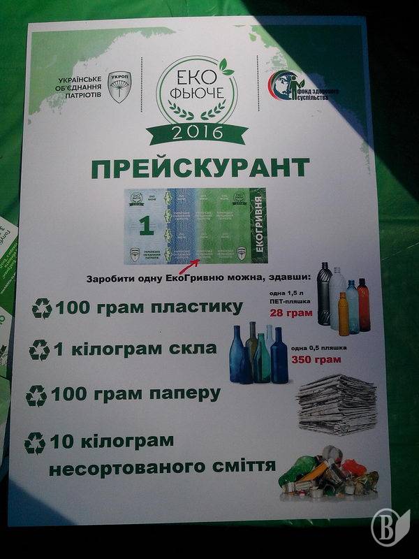 «Ми дали можливість відпочиваючим зібрати, відсортувати сміття, тобто найняли їх на роботу, за яку вони одержували еко-валюту – еко-гривні, - пояснив він. - Ці грощі можна було обміняти на цінні подарунки та різні смаколики. Наймаючи людей на роботу, ми показуємо, що питання екології, це не просто чисті річки, озера та річки. Це ще й робочі місця, надходження до бюджету. Навіть невеликий сортувальний комплекс в одному мікрорайоні може дати 50 робочих місць. Тому сьогодні на цьому прикладі ми змусимо замислитися людей і ставитися до сміття з повагою, як на Заході».